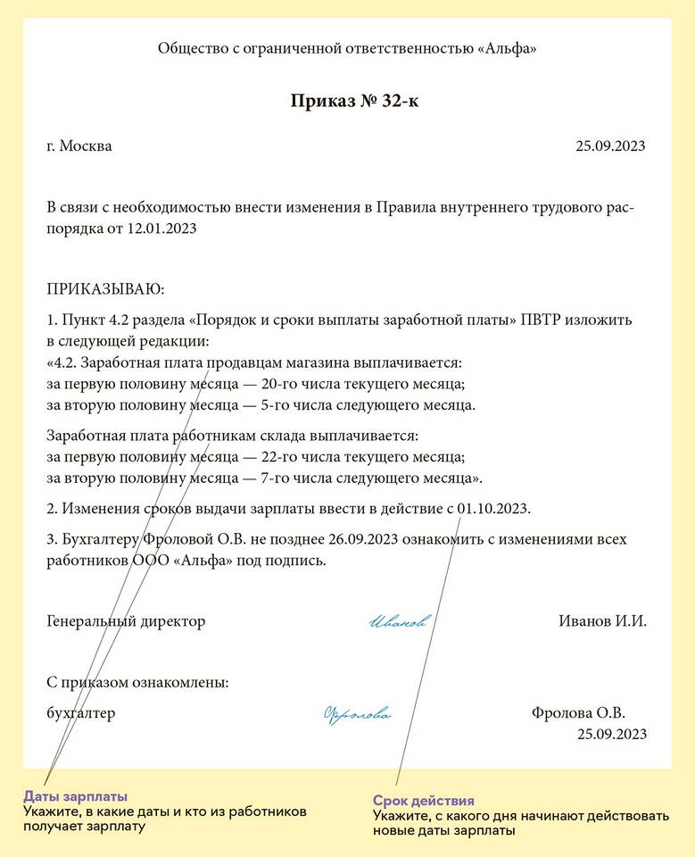 Приказ об изменении | Новые даты выплаты зарплаты |